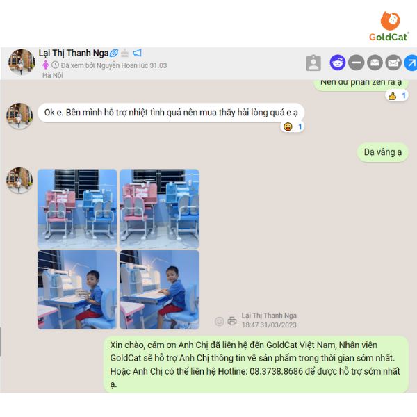 Sau một vài hôm tìm hiểu, khi đã lựa chọn mua bàn cho bé ở GoldCat. Chị Nga đã chủ động đưa hình ảnh cho 2 con chọn kiểu dáng và màu sắc. Vì nhà có cả trai cả gái, nên 2 bé đã chọn một bàn học màu hồng và một bàn màu xanh. Kết quả nhận bàn học chị Nga vô cùng bất ngờ. Bởi vì thực tế bộ bàn học chắc chắn và đẹp hơn trong ảnh mà GoldCat gửi cho chị.