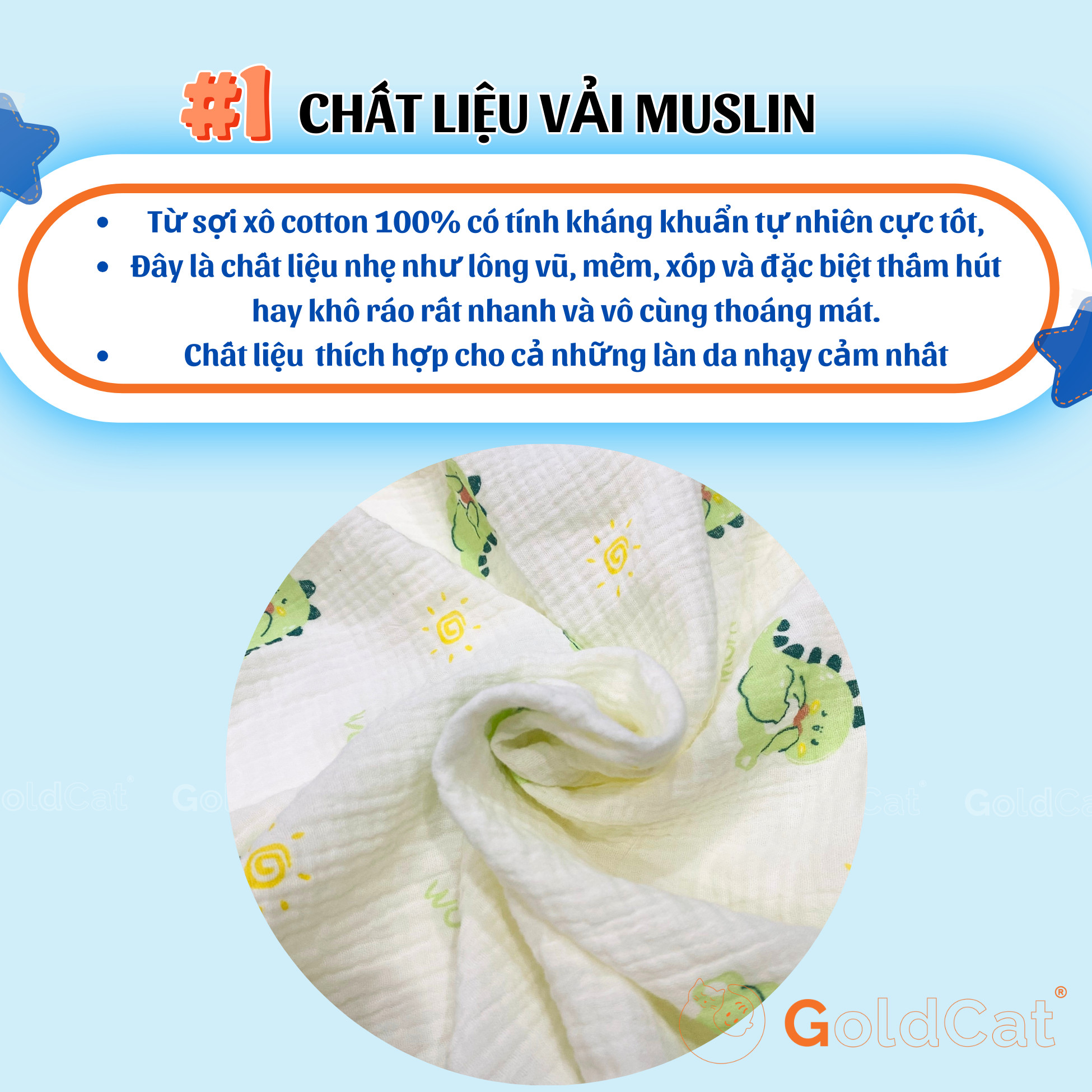 + Vải Muslin là loại vải hoàn hảo nhất dành cho làn da nhạy cảm của bé. Vì vậy mà không chỉ những bé sơ sinh, mà các bé lớn, cha mẹ cũng rất ưu chọn chất liệu vải Muslin làm chăn, khăn cho bé.