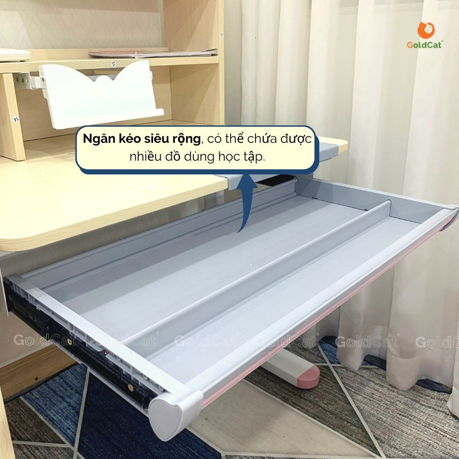 Bàn học có thêm giá để sách rộng chắc chắn, tích hợp khu vực để đèn học rộng. Ngăn kéo kép kéo trượt mượt mà.