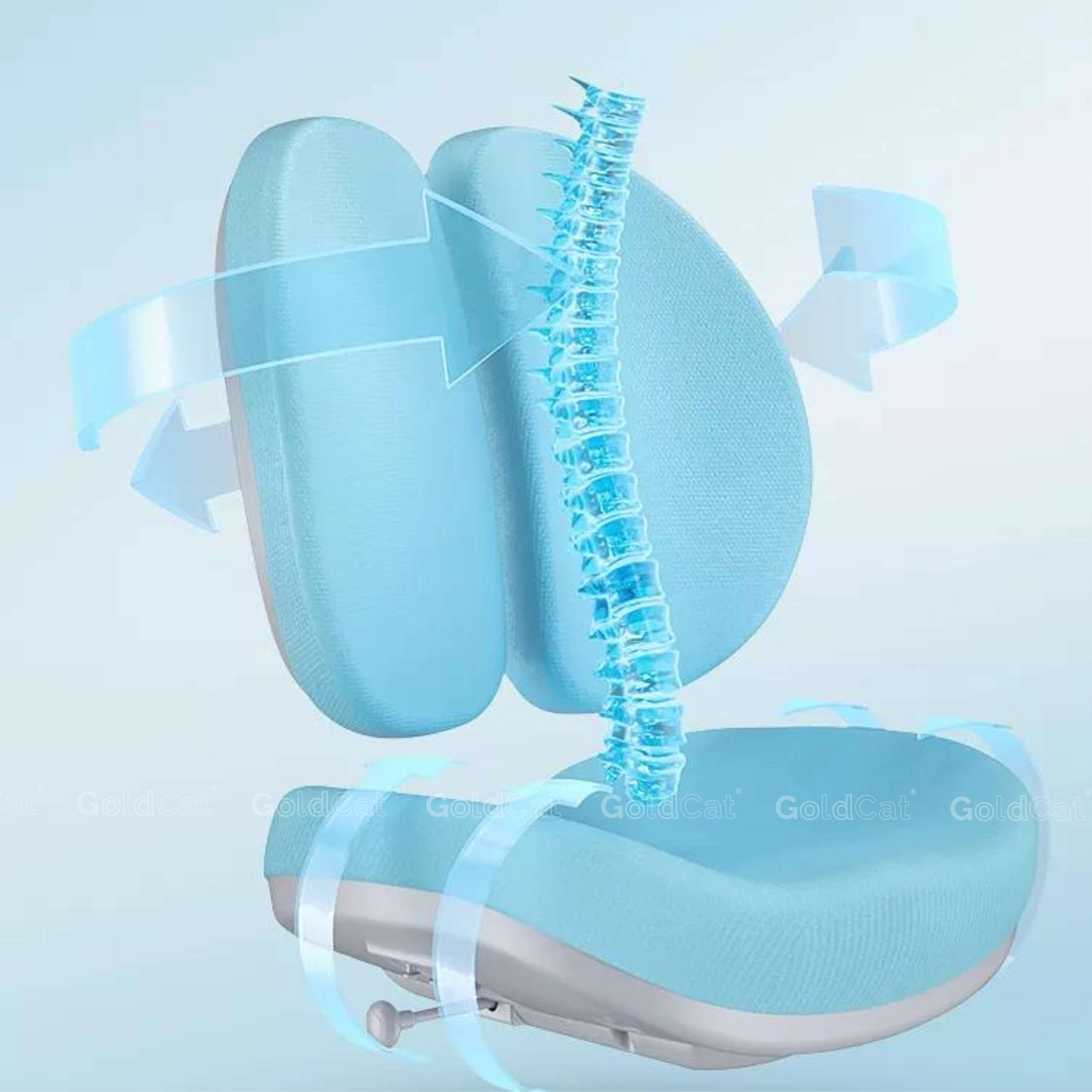 Ghế chống gù chống cận trẻ em GoldCat còn được tặng kèm vỏ đệm tựa lưng. Những khu vực có đệm mút bọt biển đều được bọc vải 3D chống thấm nước, chống bụi bẩn vô cùng hiệu quả.