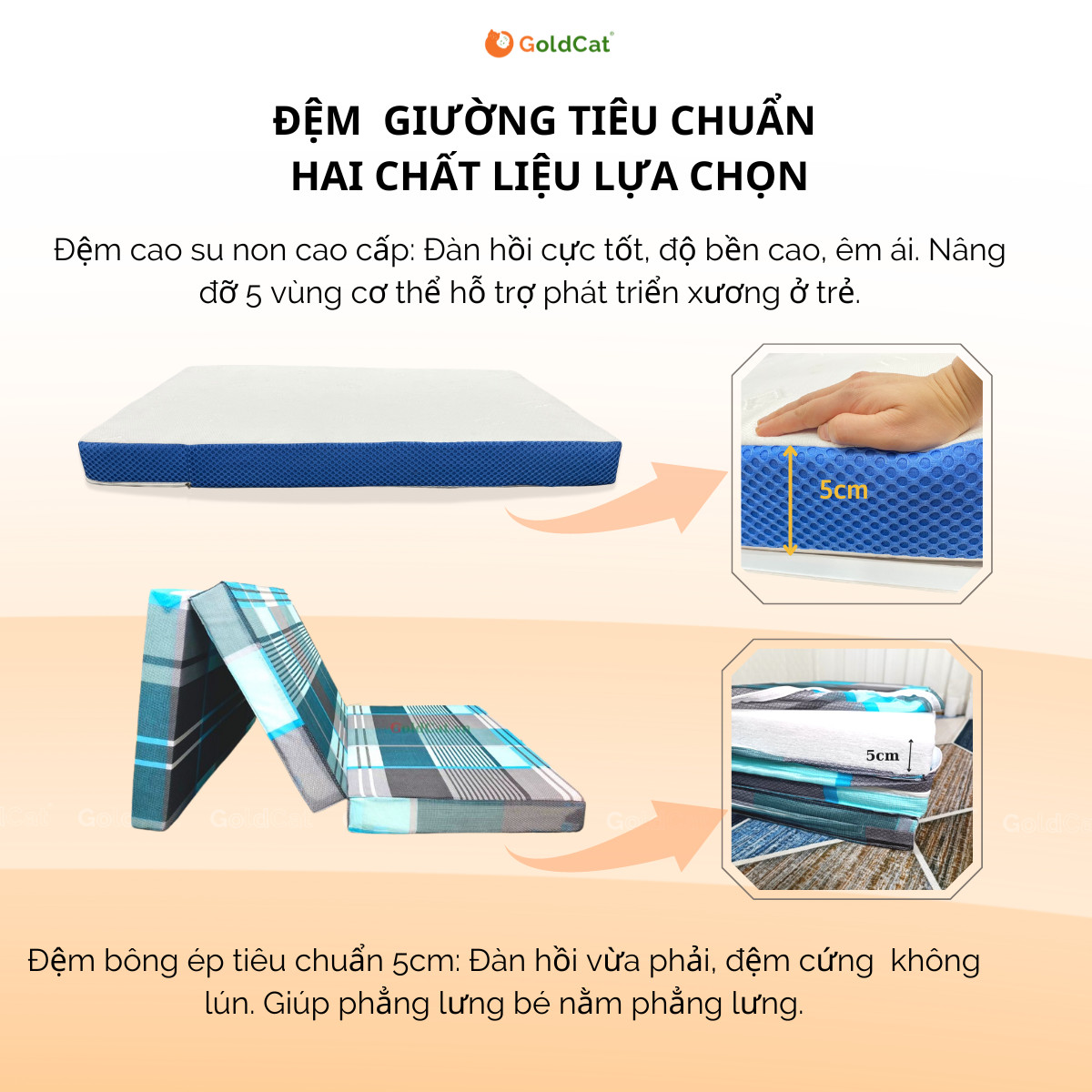Đệm bông ép tự nhiên dày tới 5cm, giúp trẻ có không gian vận động ,nghỉ ngơi an toàn. Ga giường có nhiều họa tiết đáng yêu cho các bạn nhỏ lựa chọn. Các sản phẩm ga đều có khóa kéo, giúp vệ sinh ga đệm dễ dàng.