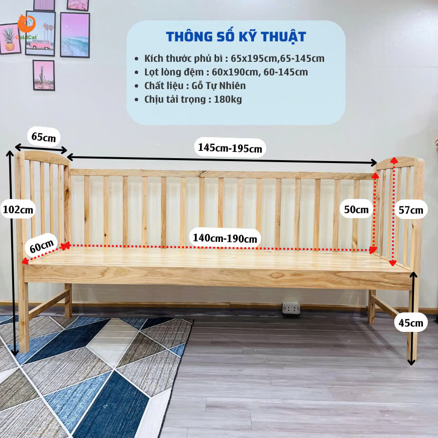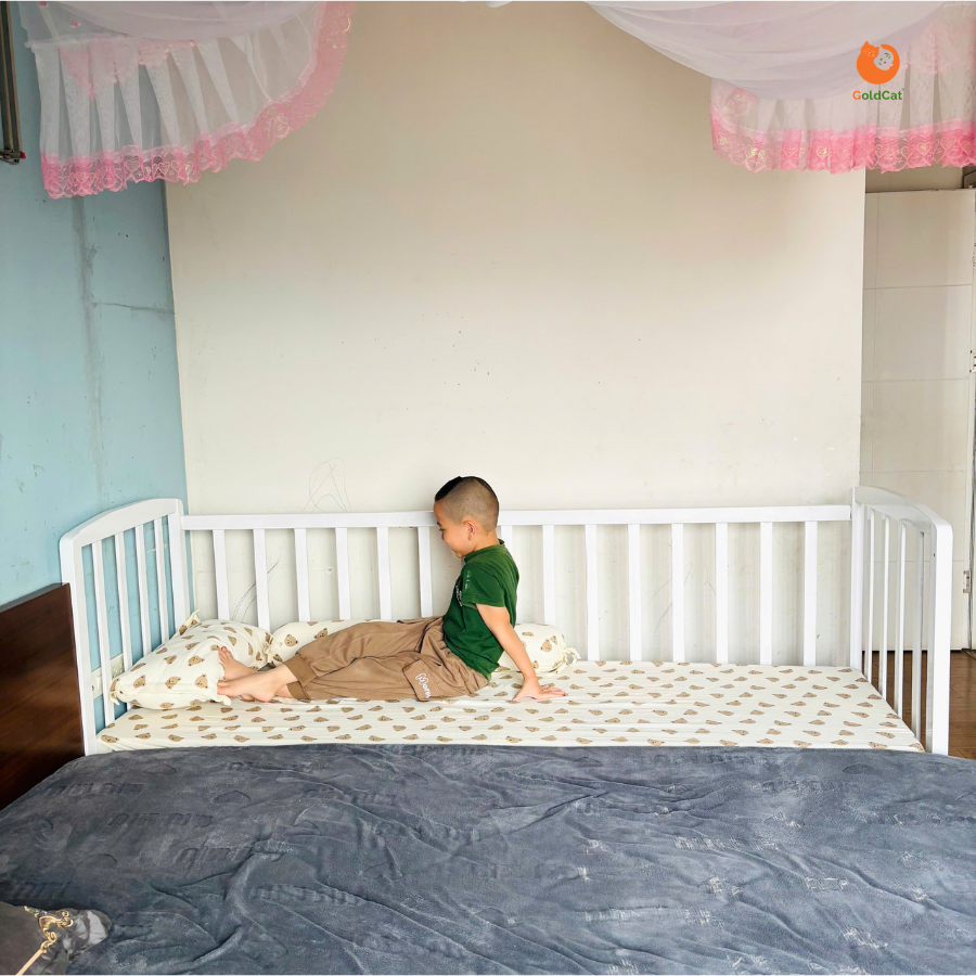 Đây là kích thước thông dụng giường trẻ em, nên dễ dàng mua đệm ga cho bé. Đặc biệt, GoldCat có sẵn phụ kiện đệm bông ép và ga thô lụa đi kèm nếu khách hàng lựa chọn mua theo combo. Ngoài ra, hãng còn cung cấp bộ màn phong cách hiện đại, gắn trực tiếp và thành giường, an toàn, tiện lợi, tính thẩm mỹ cao.