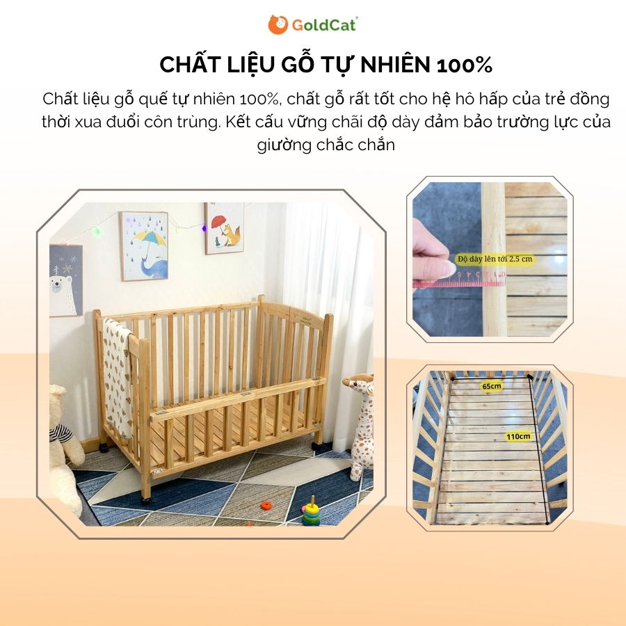 -Cũi Gỗ Quế GoldCat Màu Mộc được làm từ chất liệu Gỗ Quế tự nhiên 100%. Một trong những loại chất liệu tốt nhất để làm cũi giường, nội thất trong nhà.