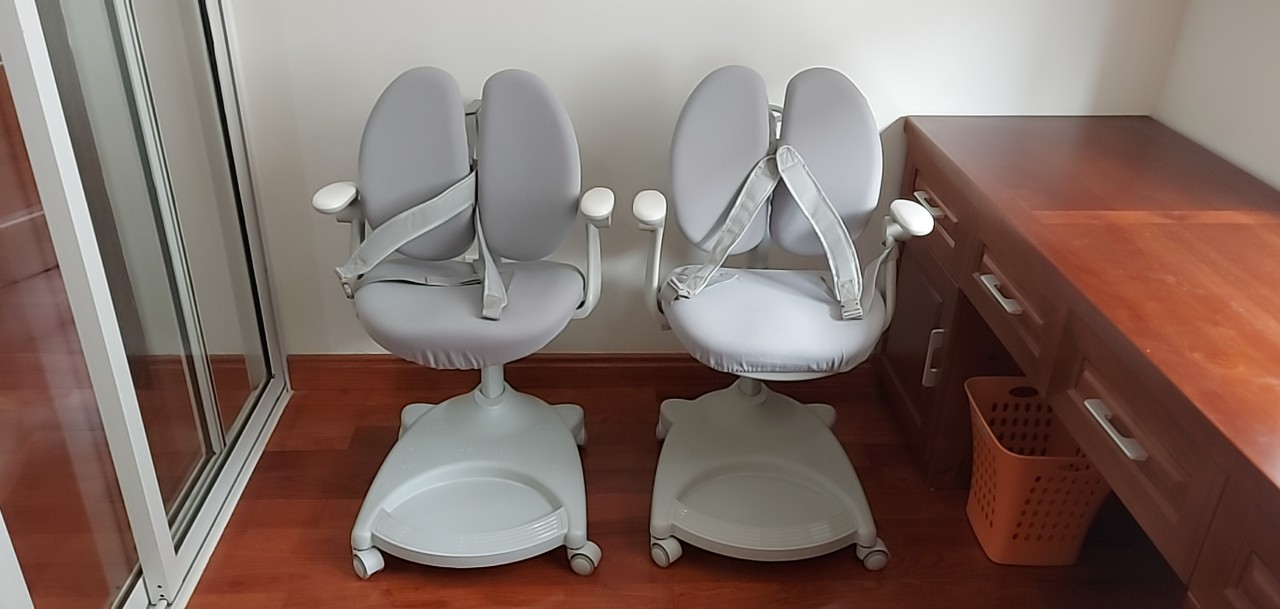 Nhà mình có 1 bé trai, 1 bé gái. Vì nhà nhỏ nên thiết kế khu vực học cho các bạn ấy cùng 1 khu luôn. Ý tưởng ban đầu là lấy ghế màu ghi xám cho bé trai và hồng cho công chúa. Nhưng cuối cùng thì lại chọn cả 2 cái màu ghi cho sạch. Lúc ấy tưởng con gái mình sẽ không thích, nhưng hóa ra con bé lại hào hứng. Thế nên mới biết không phải cô bé nào cũng cuồng màu hồng. Hoặc đến độ tuổi nào đó chúng tự nhiên không còn thích màu hồng nữa.